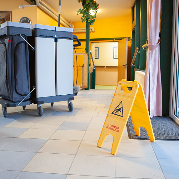 Die Mitarbeiter der Reinigung arbeiten mit persönlicher Dienstkleidung. Ihnen stehen moderne Reinigungswagen- Geräte und sonstige ergonomische Ausstattung zur Verfügung. Die Reinigungs- und Desinfektionsmittel sind hochwertig und gelistet.